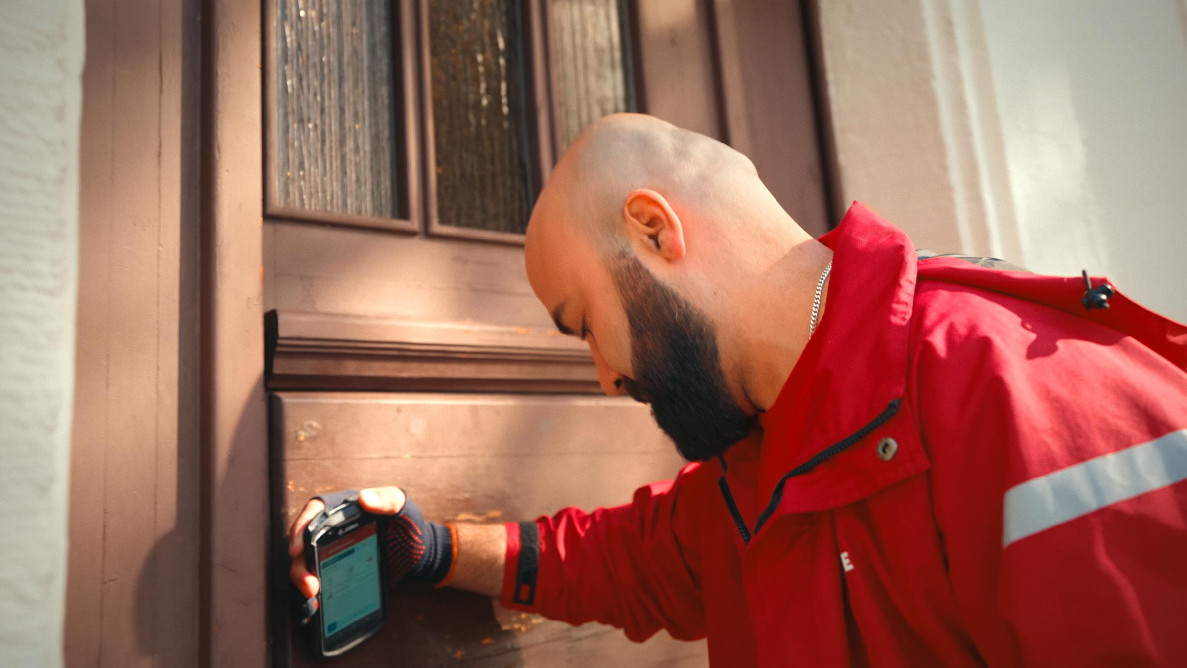 REWE-Lieferfahrer in roter Jacke bedient einen Scanner im Lager.